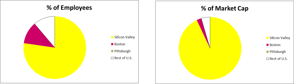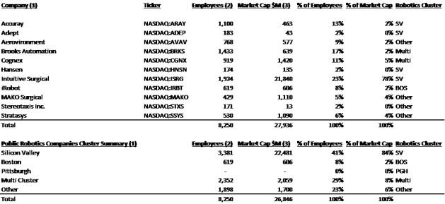 The one company that I believe might be controversial for being excluded from this list is Cognex (NASDAQ:CGNX).  However, while trying to do decide on whether to include them, I found their list of locations.  They have three locations in California including two in Silicon Valley.  That means that this ‘Boston’ company has more offices in Silicon Valley than in Boston.  I’m not an advanced (or motivated) enough analyst to find out what the exact employee breakdown is, but combined with the fact that they make vision systems and supply components rather than robots, I elected to exclude them. I acknowledge that a similar case could be made about Adept (NASDAQ:ADEP) that just made a New Hampshire acquisition, but I have decided to include them and count them towards Silicon Valley.   I do not believe that either of these decisions, substantively impact my finding that Silicon Valley is the leading cluster when it comes to public company workforce and value creation.